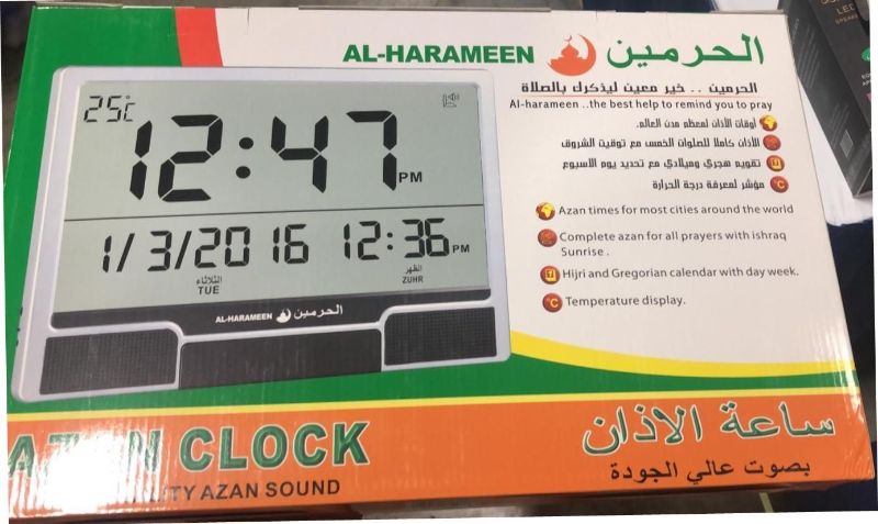 -The AL-HARAMEEN Azan Clock is a product that is designed to help Muslims pray on time.