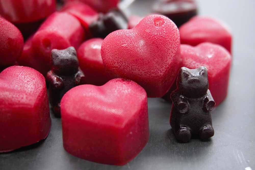 It’s worth mentioning that regular gummies contain sugar. So these, while still a little sweet, are made of beet extract and gum arabic as their main ingredients which provide a lower glycemic index for desserts.