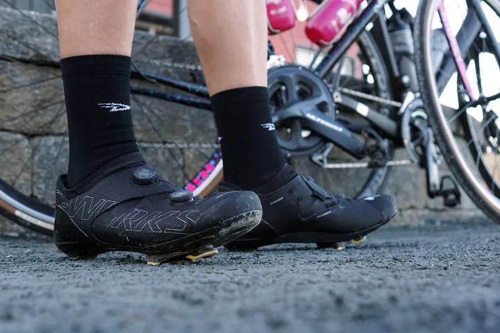 Road cycling shoes don’t have a lot of traction on the sole (usually, the only traction is from a small rubber pad on the shoe’s heel) and are incredibly inflexible, so you don’t want to be walking around in them for long periods of time.