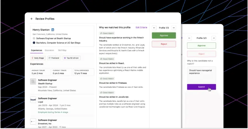 - Candidate Profiles: Profiles are presented clearly with “AI Insights” that highlight why a candidate was matched. For example: “Matches ‘Fintech’ criteria due to 3 years at Stripe.”